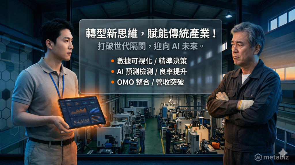 二代接班遇上老臣排斥 AI 系統?metabiz 帶您破解內部抗拒!深度解析 2026 經濟部 AI 診斷輔導與 10 萬員工數位培力補助。教您善用第三方背書,將老師傅升級為 AI 導師,用政府資金完成產線與人心的雙軸轉型。